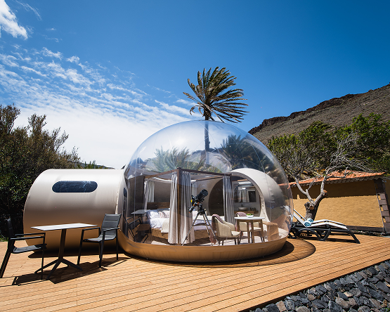 Entre sus alojamientos, destaca la Bubble Experience, una burbuja transparente equipada con cama king size y baño privado, pensada para dormir bajo un cielo estrellado. Es una experiencia de turismo sensorial única en Canarias, donde el lujo no está en la emoción de vivir la naturaleza desde dentro.