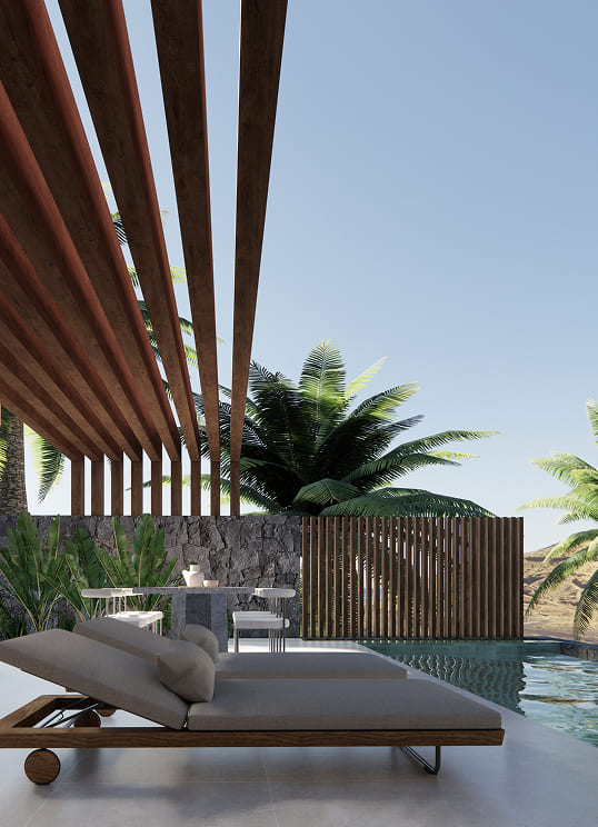 Dentro del Ávalos Sustainable & Wellness Resort en La Gomera, cada villa de dos dormitorios combina diseño contemporáneo y arquitectura sostenible.